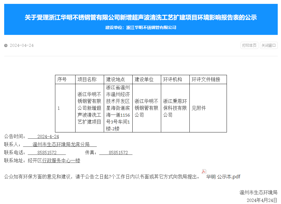 4月24日,溫州市生態(tài)環(huán)境局受理浙江華明不銹鋼管有限公司新增超聲波清洗工藝擴(kuò)建項(xiàng)目環(huán)境影響報(bào)告表并對(duì)外進(jìn)行公示,公示期:7個(gè)工作日。