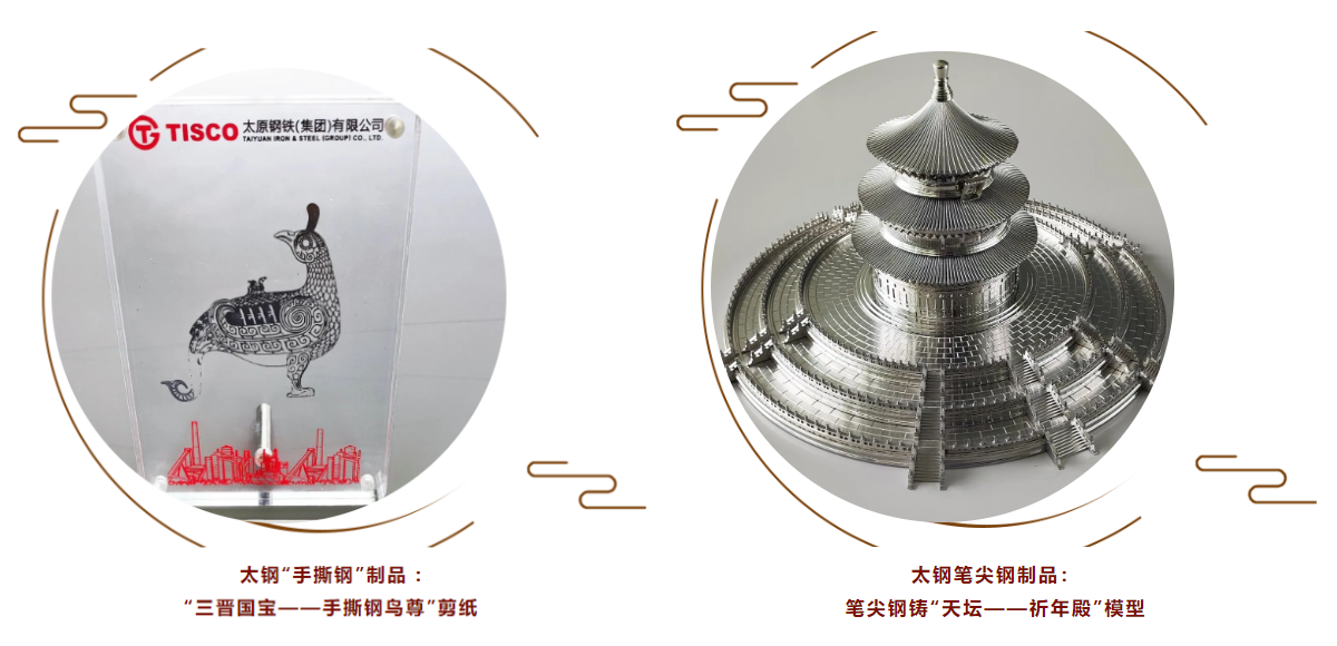 據(jù)了解,此展品分別是太鋼“手撕鋼”制品 ——“三晉國(guó)寶——手撕鋼鳥(niǎo)尊”剪紙,太鋼筆尖鋼制品——筆尖鋼鑄“天壇——祈年殿”模型。