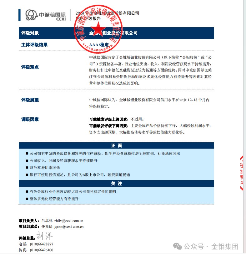 近日,金堆城鉬業(yè)股份有限公司榮獲國內權威信用評級機構中誠信國際信用評級有限責任公司AAA主體信用評級。這是金鉬股份首次參與外部評級,并獲得主體信用評級AAA的最高等級。
