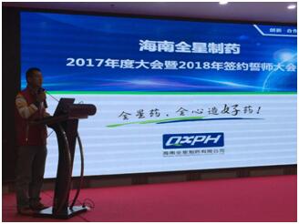 海南全星制藥2017年度大會暨2018年簽約誓師大會圓滿結束2017年12月25-28日,海南全星制藥有限公司于海口永嘉大酒店召開了2017年度大會暨2018年簽約誓師大會。大會以“新起點·轉型·創新·合規”為主題,總結2017年銷售工作及存在問題,并對2018年做出了詳盡的銷售工作計劃。會議在暖場片及參會人員熱烈的掌聲中拉開帷幕。